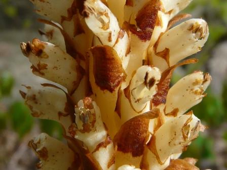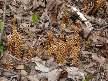 One of the common names for the plant is “bear corn,” an apt name for a plant that plays a surprisingly important role in the life of bears in eastern North America. Even though Conopholis is hardly an abundant species, the plant comprises ten to fifteen percent of the diet of bears in the Smoky and Shenandoah Mountains. When the total annual energy content of various botanical “bear foods” is added up, acorns top the list (67% of available energy) but amazingly Conopholis comes in second (16%). Although some websites and books claim that the bears eat the whole “cob,” biologists who have actually witnessed bears dining on the plant report that it is the little fruits that interest the bears, not the whole flowering stalk. I suspect, though, that the sample size for these observations is quite low…
