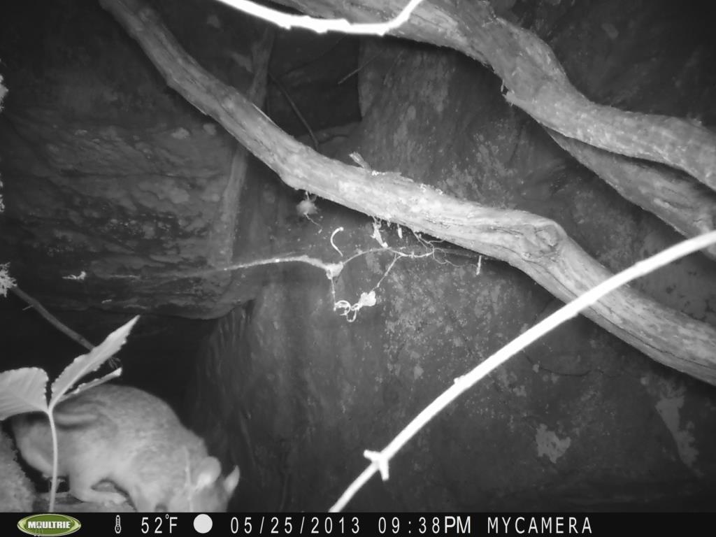 A nighttime visitor: what appears to be an Allegheny woodrat (Neotoma magister). This species is one of the “packrats” that make big nests. It is in decline over much of its range due to habitat loss and raccoon-transmitted parasites. Woodrats love rocky jumbles.
