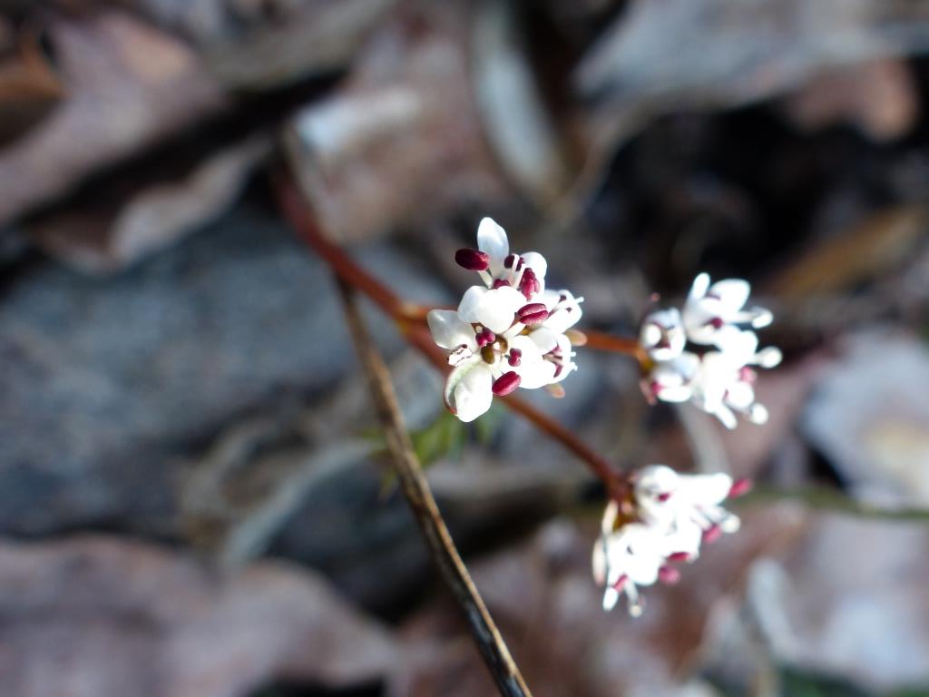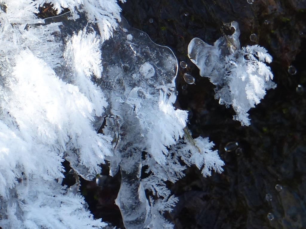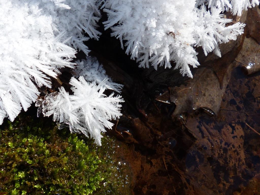 Amazingly, given the cold, the springs were still running. This flowing water created some beautiful ice formations on the rocks all around. When water vapor rises from the stream, it hits cold, dry air. This is an unstable mix, ripe for an encounter with a pointy nucleation site: an icy strand of moss or rock edge. Once they get started, these crystals build on themselves, growing “flowers” from the air. An icy foreshadow of the spring ephemerals? The largest ones are a couple of inches across. Similar formations are found in polar seas and host very unusual communities of bacteria.
