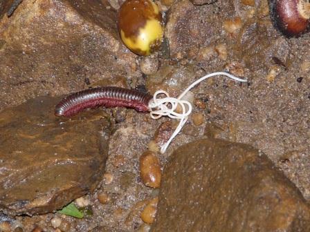 The rains have brought all kinds of strangeness to the woods. As we wrapped up our surveys of stream salamanders, a cry went up: nematomorph! (Yes, this is an advanced class; in Introductory Biology the cry would have been, OMG-gross…) Lying on the stream bed was half of a Narceus millipede with a long white worm writhing its way out of the broken body. The millipede’s front legs were still grasping feebly at the ground. It had dragged itself several feet to this spot, leaving its other half discarded on the wet rocks.