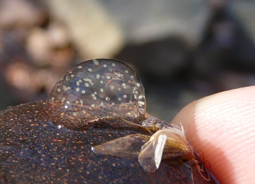 One such hickory shell had some passengers, a dying caddisfly and a cluster of minute eggs encased within a blob of jelly.