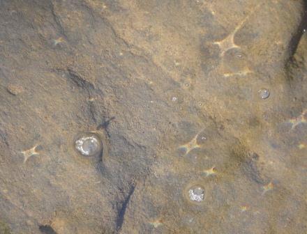 I took particular pleasure in seeing these two rafters. This is the stream that a few months ago was choked with silt from erosion on the golf course construction site. I took the eggs and the recolonizing caddisfly as signs that, although the stream is still severely impacted by sediment, some aquatic animals have persisted here and others are returning. Soon, I hope, young caddisflies and snails will join the bubbles and stars swimming and crawling in the stream’s waters.