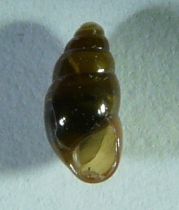 This tiny snail is about the size of a grain of rice (5mm long). Chris Waldrup brought it to me after finding it under a log. The snail belongs to the genus Cionella, probably Cionella morseana (the genus also goes by the name Cochlicopa). Reproduction in this genus of snails is mostly through self-fertilization, confusing the taxonomy of the group by creating a star-burst of mini-groups. Studies of European members of the genus have found that some named “species” are collections of multiple lineages.