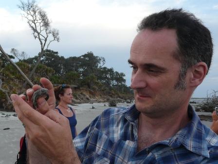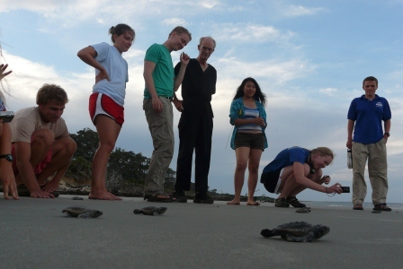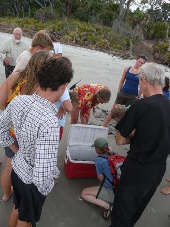 Two nights ago, Gale Bishop has his colleagues at the St Catherine’s Island Sea Turtle Conservation Program were kind enough to invite the Sewanee Island Ecology Program crew along on the year’s first release of baby turtles. These little hatchlings all came from the same nest, a nest that was dug out by hand (not flipper) to save it from a predatory ghost crab that had started to munch its way through the clutch. The crab got three; one hundred and fourteen were released.