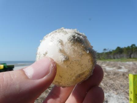 Loggerhead sea turtle egg. Unlike many reptilian eggs, sea turtles egg shells are partly calcified, giving them the feel of a bird egg.