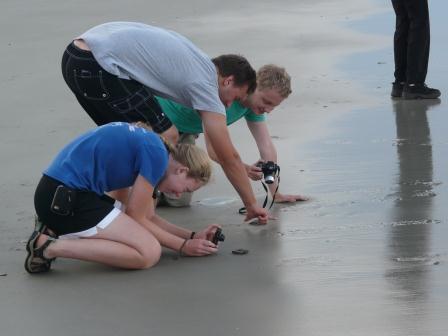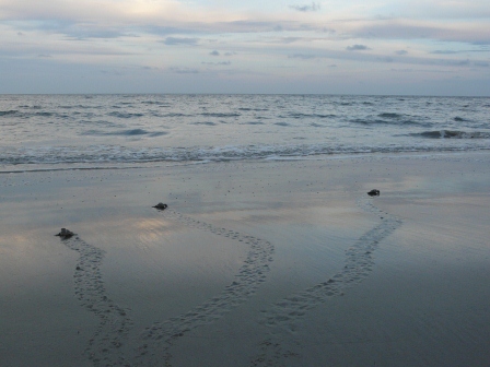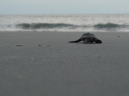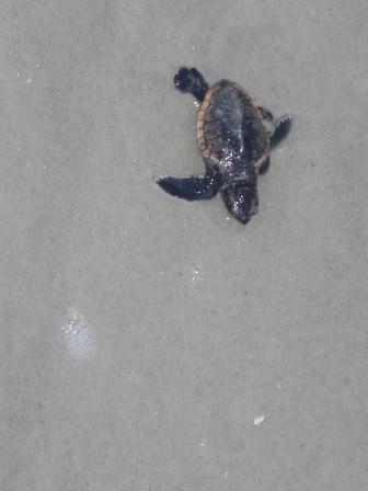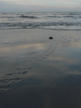 The following photographs are from the release of the turtles onto the beach. The hatchlings propel themselves down the beach on their flippers, then get caught up in the breaking waves.