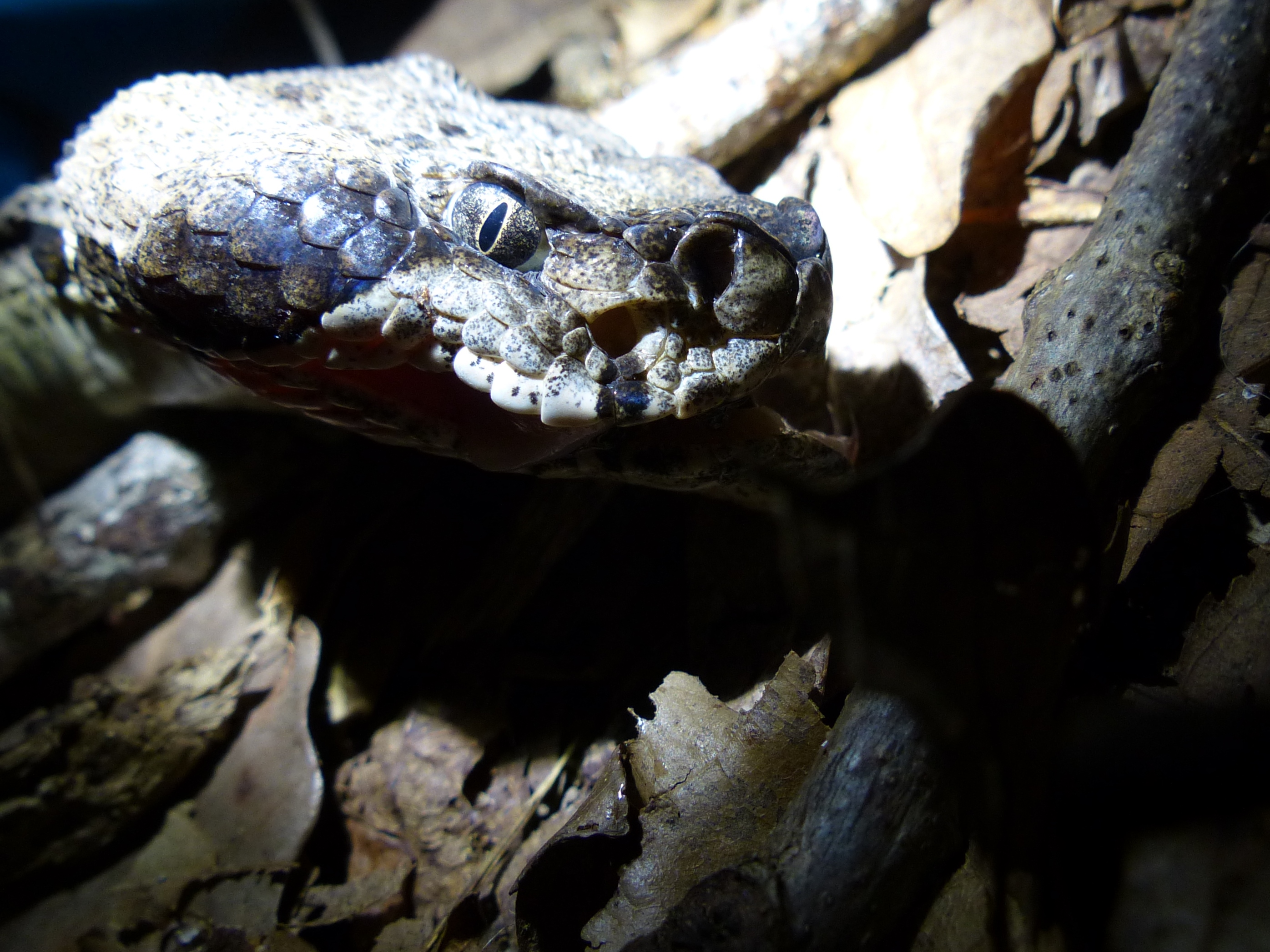 The nostril (higher) and pit organ (below) jut into the world. Inside the pit organ, a membrane hides a profusion of nerve endings and blood vessels. Nerve receptors tingle when temperature changes; blood carries away last second’s heat, letting the snake know moment-by-moment how its thermal environment is changing. The pit organ’s information runs directly to the same part of the brain that receives signals from the eyes. So “heat” is seen by rattlesnakes. The pits are extra eyes, functioning like pin-hole cameras. Oh, to be able to experience such a synesthetic world, if only for a few seconds.