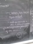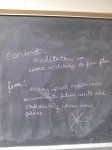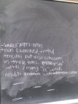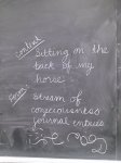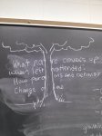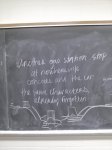 After my students turned in their latest assignment — a creative piece on “place” — I asked them to represent the form of their writing through a few wordless chalk marks on the board. They also summarized the main themes of content and form in a couple of sentences. This was improvised work: no preparation, go to the board and write.