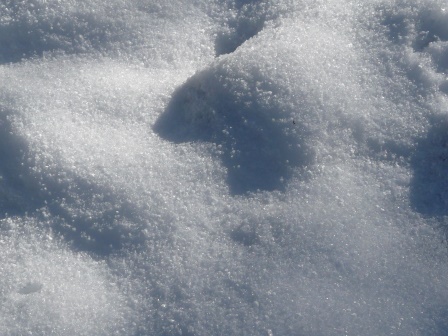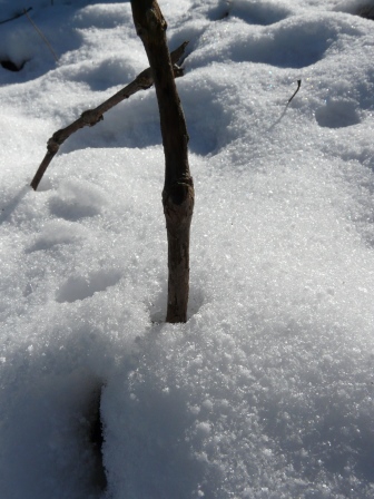 Where-ever dark objects protrude, they soak the sun’s weak heat. Gradually the surrounding snow sublimates, leaving sleeves of empty space around twigs and leaves.